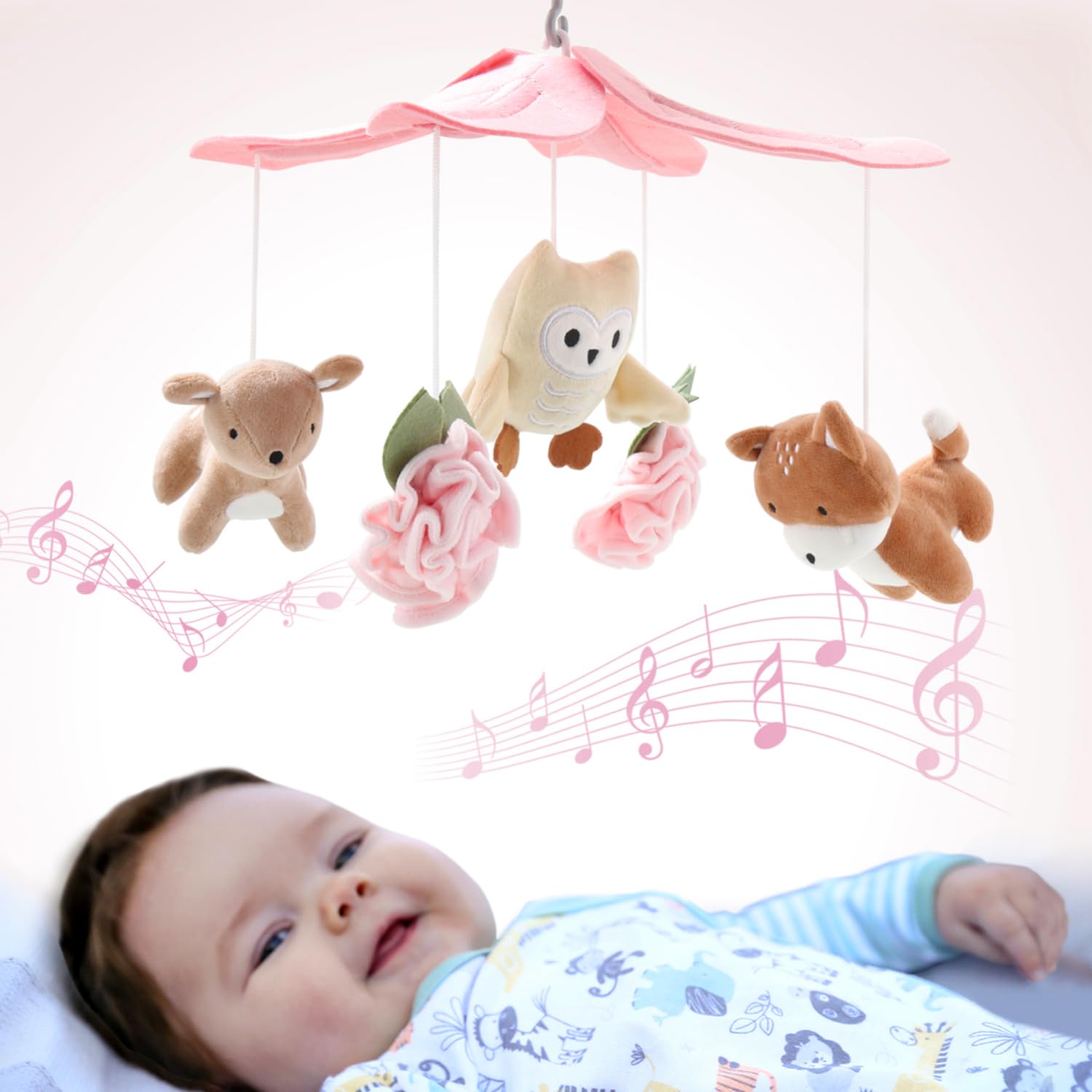 - Charming Nursery: More than just a musical nursery mobile, this piece doubles as the cutest nursery decor. The pink design, vibrant colors toys, and playful forest theme add fun to any room.