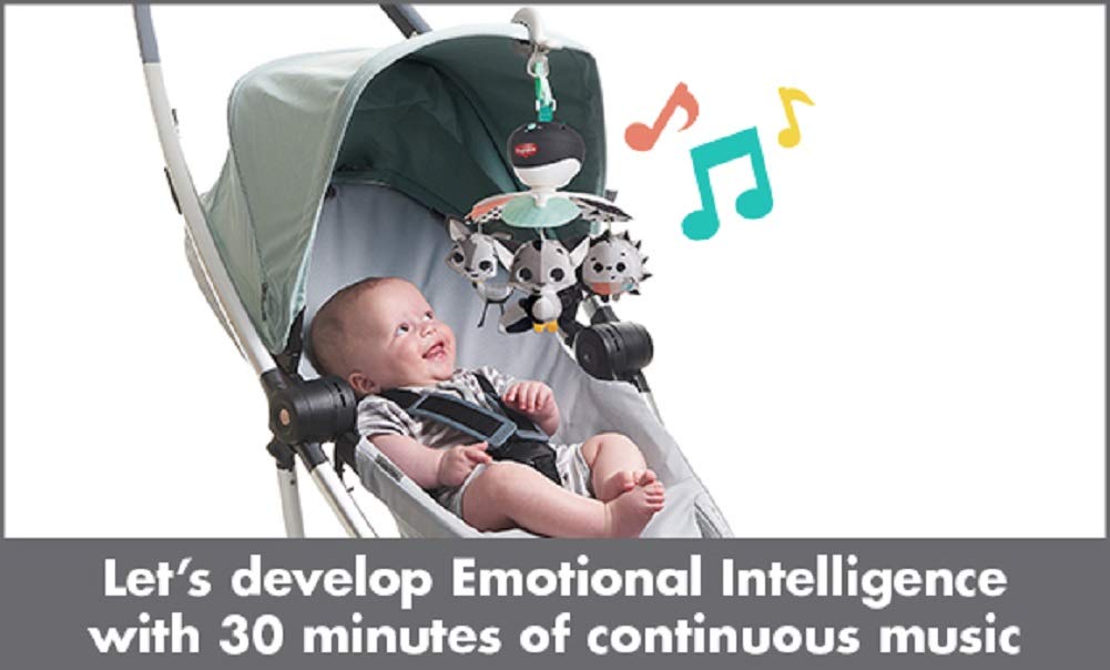 The Magical Tales™ Take-Along Mobile is designed to support your baby’s development at home or on the go. The engaging black and white contrasts and colorful hanging toys spin to provide visual stimulation for babies as their sight is still developing. Babies can practice their communication and language skills, while lying in their crib or sitting in their stroller, by cooing at the smiling characters. The cute Magical Tales toys stimulate baby's senses and encourage the development of fine motor skills. The mobile's clever design makes it easy to attach to most play yards, strollers, and bassinets, making it the perfect travel toy. The mobile features 30 minutes of 5 different melodies to help soothe and amuse your little one. Feeling secure is a crucial element in your baby's development. Having soothing, familiar music available in unfamiliar, new places reassures your baby and supports emotional development. From a very young age, babies will enjoy a sense of security and joy while interacting with this whimsical mobile.