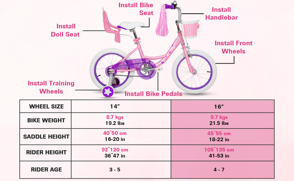 - Size Recommend: 14" bike for 3-5 years (35" - 47") boys & girls. Note: Measure kid’s INSEAM and compare with SADDLE HEIGHT to check if the rider can touch the ground.