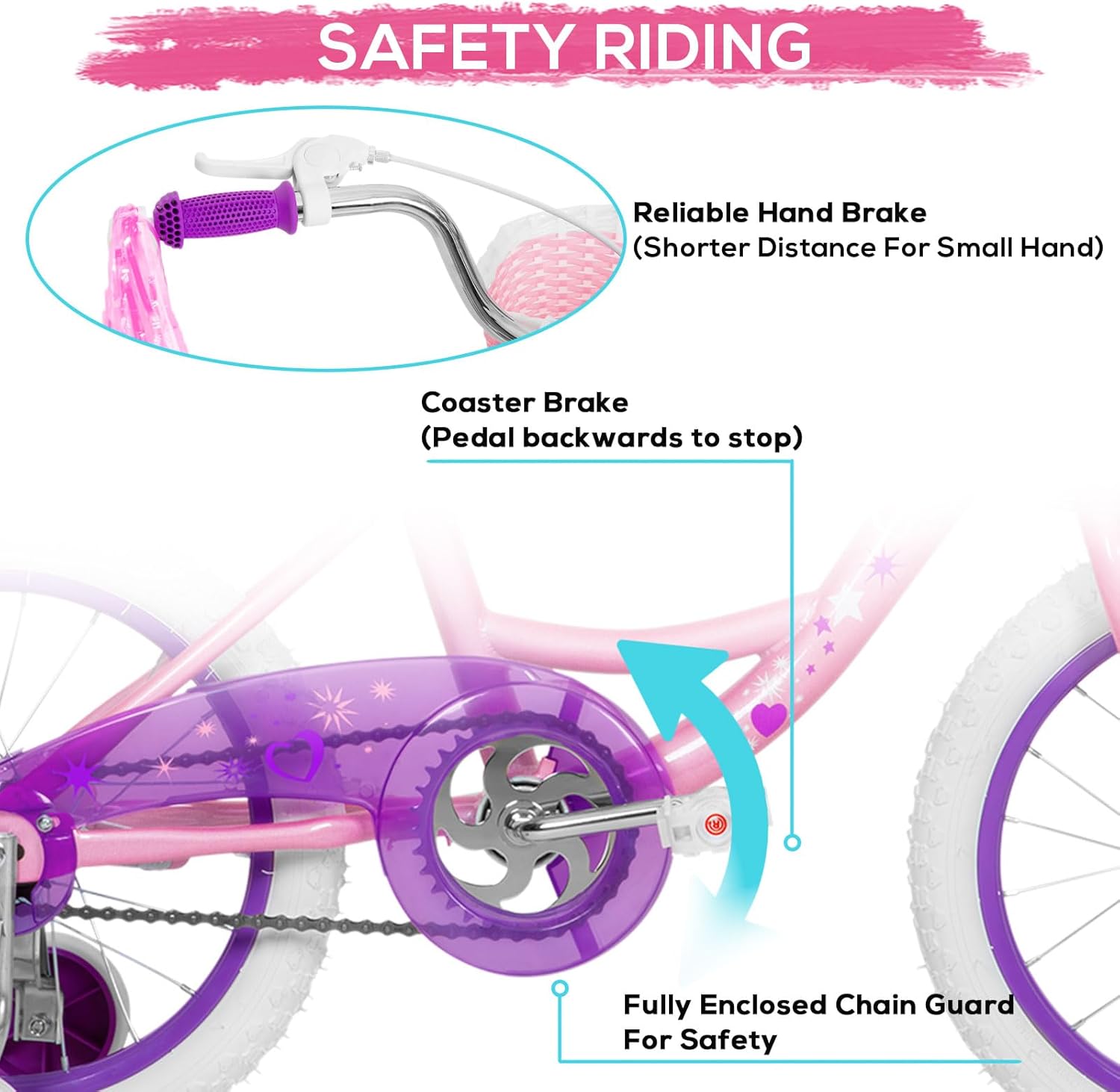 - Protected: Easy to operate handbrake, which is suitable for small kids who don’t have enough power to control brake by hand. In the meantime, the full coverage chain guard to protect little hands, feet, and clothing and provide a safer pedaling environment.